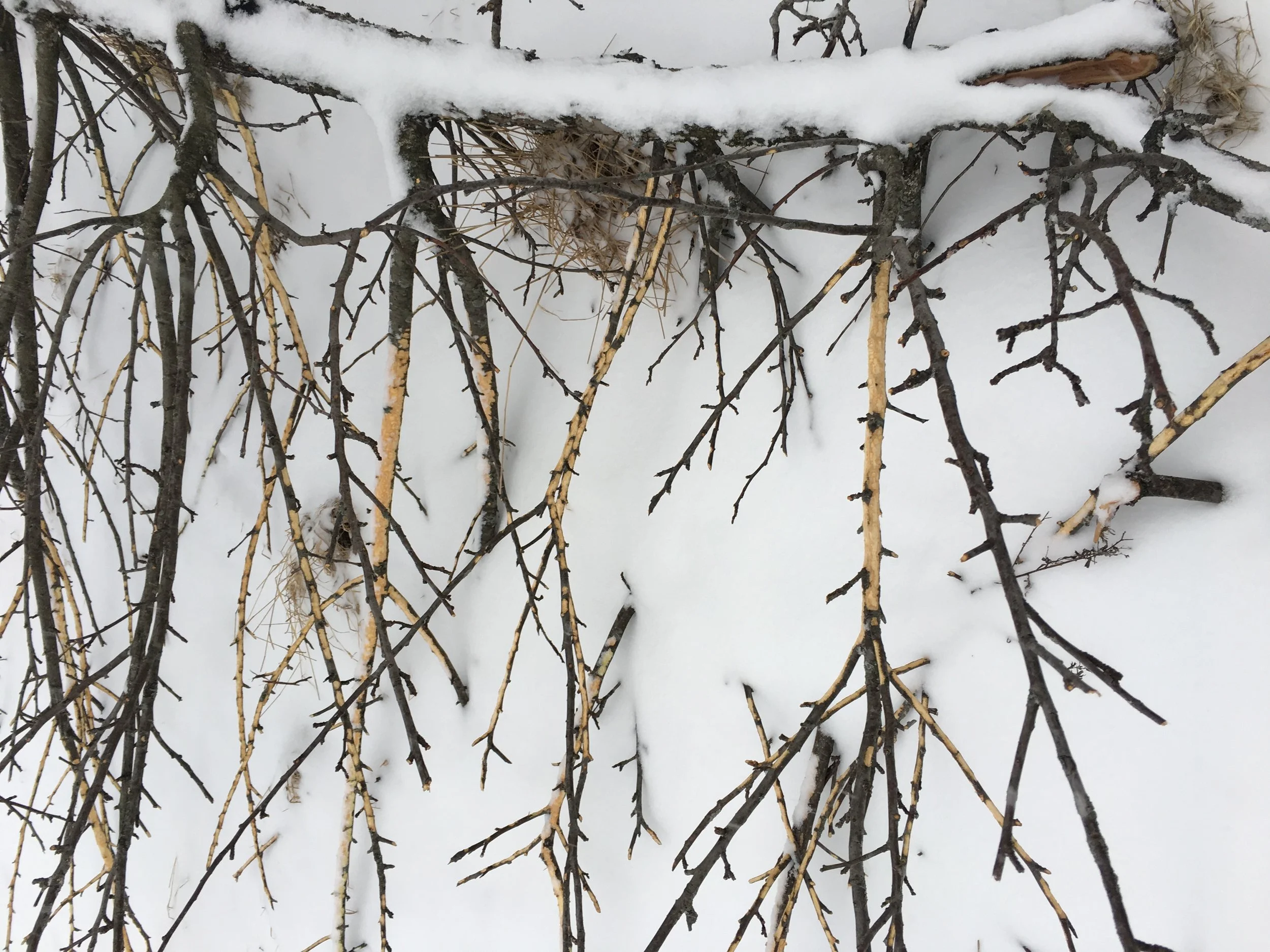 Winter-browsed apple branch prunings left on the ground for rabbits and deer. In exchange, they leave their manure to fertilize the orchard trees.